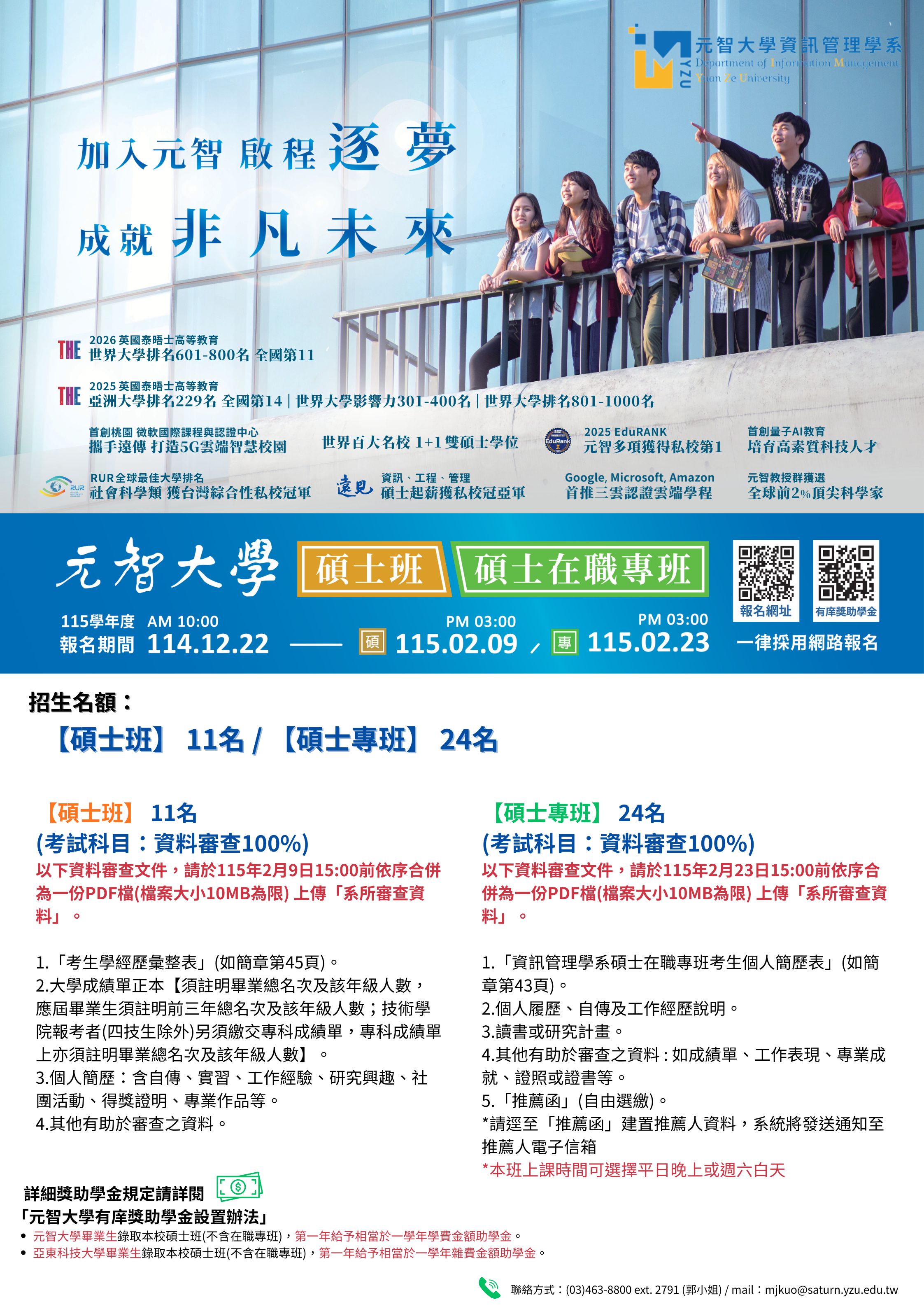 [碩士班]- https://www.yzu.edu.tw/admissions/index.php/tw/yan-jiu-suo-zhao-sheng/shuo-shi-ban/996-yuan-zhi-da-xue115xue-nian-du-shuo-shi-ban-zhao-sheng-jian-zhang-gong-gao