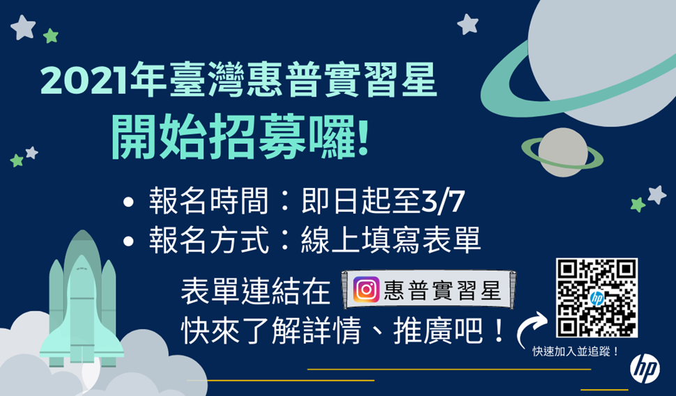 您好!我們是來自台灣HP惠普的星球探員,正在積極搜尋2021年能加入我們、成為實習星的同學!